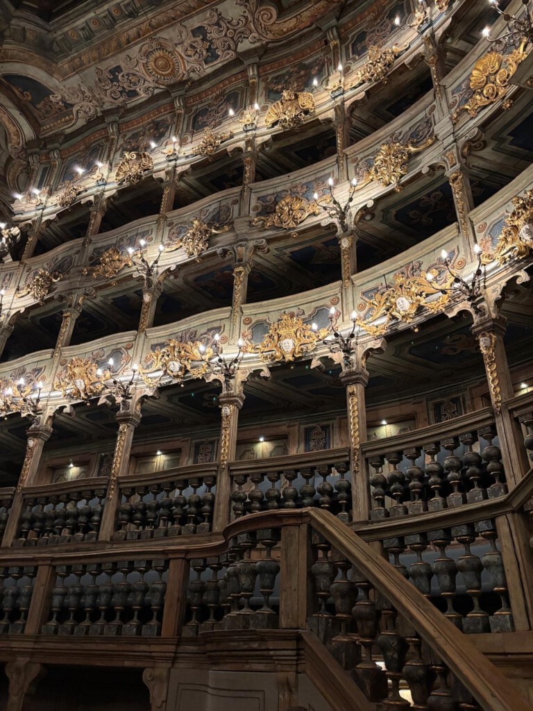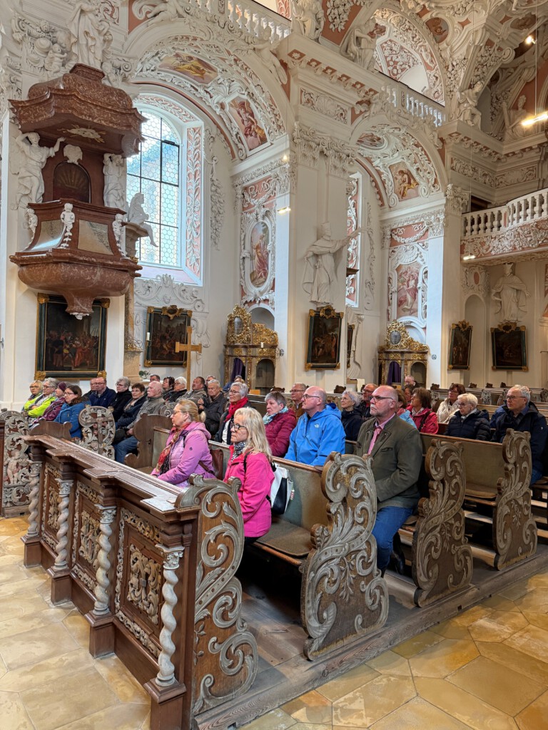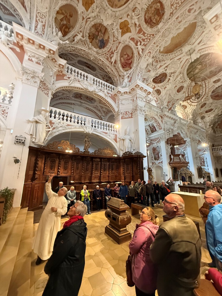 Die Teilnehmer hatten die Möglichkeit den beeindruckenden Theatersaal zu besichtigen und sich anschließen über die Geschichte des Hauses und seiner Nutzung im Besucherzentrum des Weltkulturerbes zu informieren. Beindruckt von der kunstvollen Ausstattung des Opernhauses und der interessant gestalteten Ausstellung im Redoutenhaus machte sich die Reisegruppe auf den Weg zur nächsten Station ins Klosterdorf Speinshart in der Oberpfalz. Nach einem Mittagessen im Kloster-Gasthof wurden die Mitglieder der beiden Vereine bereits von Abt em. Hermann Josef Kugler am Portal der barocken Klosterkirche erwartet. Auch hier fanden sich die Teilnehmer wieder in einem beeindruckenden und kunstvollen Raum. Die Klosterkirche Speinshart zählt mit ihrer barocken Ausstattung zu den schönsten Kirchen in Süddeutschland. Nach einer Führung in der Kirche folgte noch ein Rundgang durch das Kloster. Der Kreuzgang, der Kapitelsaal und das Refektorium wurde für die Reisegruppe geöffnet.