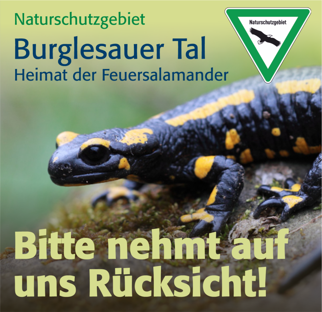 Das Burglesauer Tal ist auch Heimat der Feuersalamander. Um besondere Rücksichtnahme wird gebeten. Gerade an sonnigen Tagen sind die Amphibien verstärkt im Straßenbereich unterwegs. Ausdrücklich wird darauf hingewiesen, dass Feuersalamander nicht berührt werden dürfen. Der Feuersalamander ist besonders schutzwürdig. Informationen zum Feuersalamander gibt es auch im Internet unter burglesau.net/feuersalamander